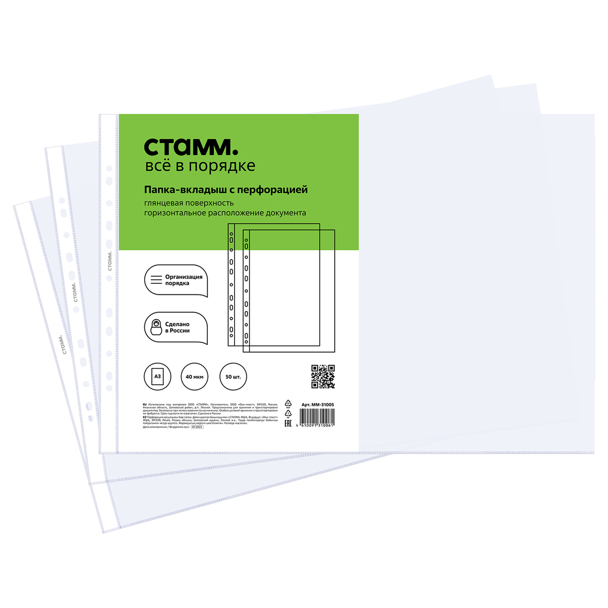 Файл А3 40мкм СТАММ КОМПЛЕКТ 50 шт, горизонтальные, глянцевые