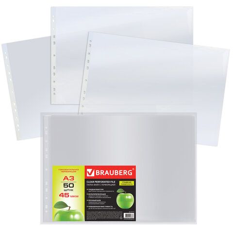 Файл А3 45 мкм BRAUBERG, 50шт., гладкие, яблоко ГОРИЗОНТАЛЬНЫЕ