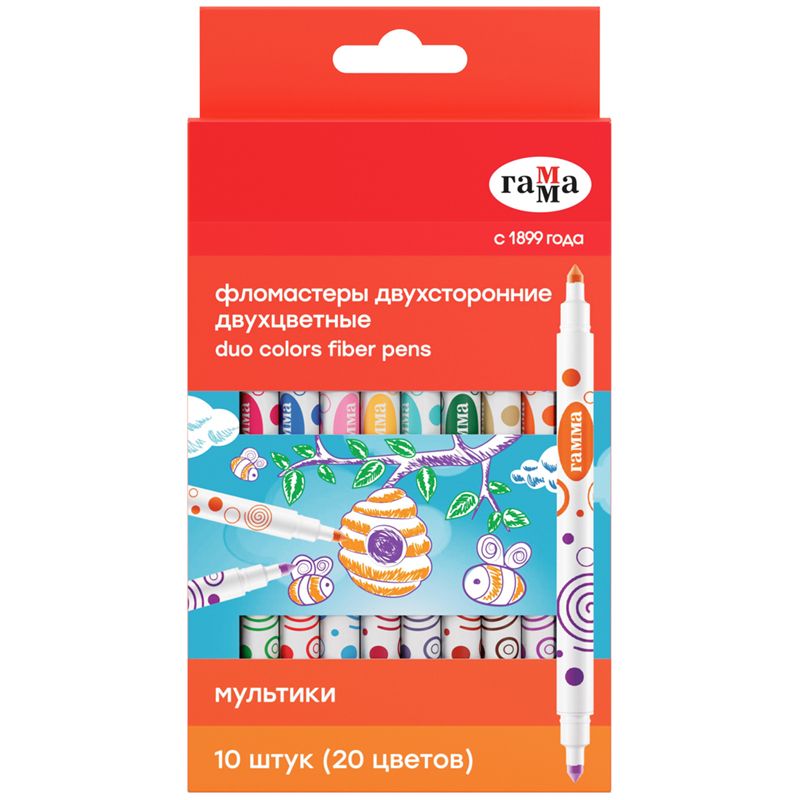 Фломастеры 20цв., 10шт.,двухсторонние Гамма «Мультики», двухцвет., смываемые, картон. упаковка