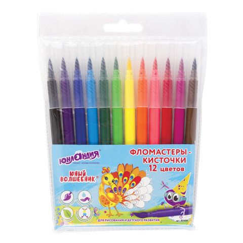 Набор фломастеров с чернилами на водной основе. Наконечник в форме кисти позволит закрашивать большие фигуры. Нетоксичные. Практичные и безопасные
