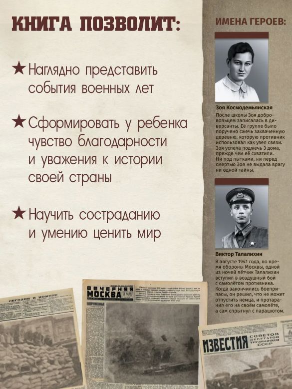 Книга «Битва за Москву» подробно расскажет о непростой обороне Москвы, о жизни столицы в военные годы, о подвигах защитников нашей Родины. Великая Отечественная война — трагичная, но героическая часть нашей истории. Поэтому очень важно помочь ребёнку во время знакомства с этими непростыми событиями. Серия «История: люди, факты, события» от торговой марки Malamalama — это книги, в которых собрана самая важная информация о войне и великой Победе. Красочные, реалистичные изображения, военная техника, имена героев, факты, цифры, даты — самое важное на каждой странице.