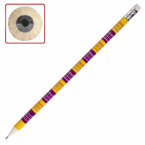 Круглый корпус карандаша покрыт печатью с таблицей умножения и оснащен ластиком. Карандаш выполнен из дерева высокого качества. Грифель диаметром 2,2 мм имеет твердость HB и отличается прочностью. Карандаш заточен и поставляется в пластиковой тубе с крышкой.