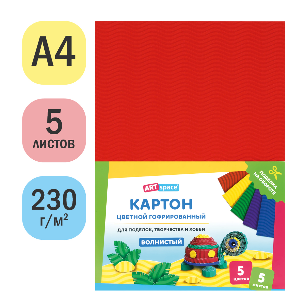 Картон цветной А4, ArtSpace, 5л., 5цв., гофрированный, волнистый, в пакете