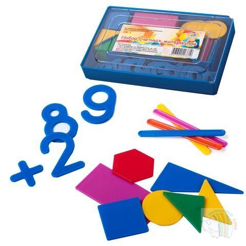 В наборе: геометрические фигуры, цифры, математические знаки, палочки.