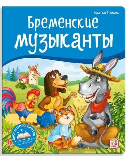 Серия «Библиотека сказок» — это любимые сказки от торговой марки Malamalama. «Бременские музыканты» — это знаменитая история братьев Гримм об осле, собаке, коте и петухе. На ярких страницах книги перед вашим малышом оживёт история об отважных волшебных животных, которые знают, что такое дружба и взаимовыручка, и ни за что не остановятся перед трудностями! Объёмные pop-up элементы помогут окунуться в неповторимую атмосферу. А красочные иллюстрации поднимут