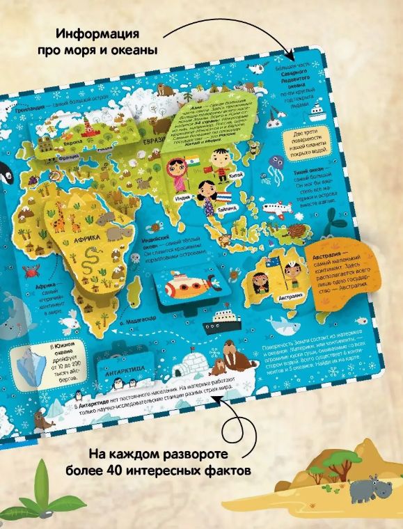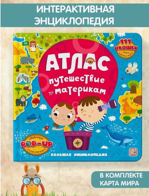 Книга «Атлас. Путешествие по материкам» из серии «Большая энциклопедия» — это настоящий атлас мира для вашего малыша. Вместе с персонажами-путешественниками на страницах книги он посетит каждый материк, узнает о нём много интересных фактов, познакомится с флорой и фауной, самыми интересными и знаменитыми достопримечательностями. Во вложении к энциклопедии — большая карта мира, по которой удобно изучать государства и флаги.