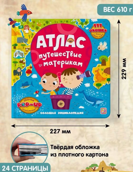 Детская книжка с окошками Атлас - энциклопедия полезных знаний для детей 6-8 лет. Он станет помощником в развитии ребенка и окажет помощь при подготовке к школе. Это детская энциклопедия содержит много иллюстраций, ярких картинок, которые помогут ребенку расширить свой кругозор и весело провести время. Открывай окошки книжки панорамы и узнавай невероятные факты. Книга содержит задания для развития памяти, мышления и мелкой моторики, учитывают особенности детской психологии. Книжка это увлекательный досуг для всей семьи, для мальчиков и девочек. Игра позволит развивать логику и тактику, а т