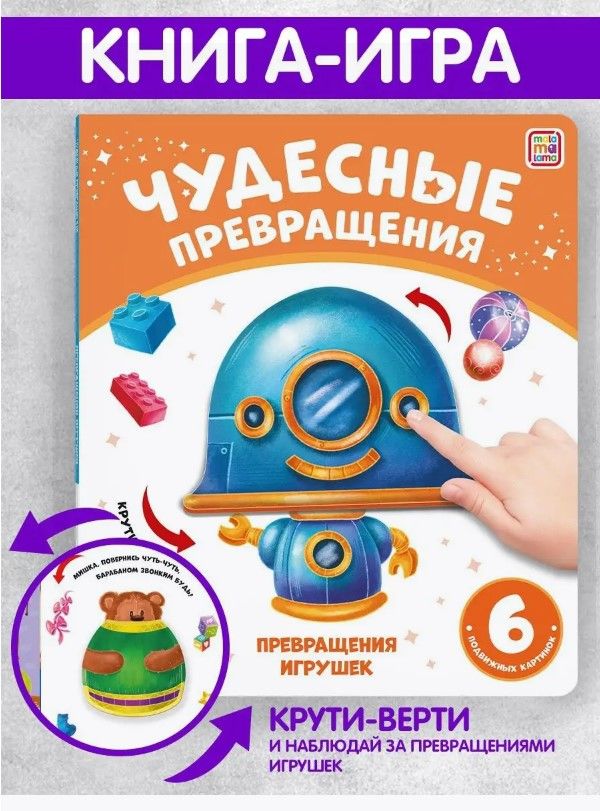 Серия «Чудесные превращения» от торговой марки Malamalama — это книги, полные волшебства. На каждом развороте — добрый стишок и вращающийся элемент, благодаря которому одна забавная и милая фигурка становится совершенно другой. Малыш сможет повернуть его пальчиком, не прилагая никаких усилий, и увидеть настоящее чудесное превращение. В книге «Превращения игрушек» самые обычные предметы обращаются в барабан, погремушку, кораблик и другие любимые игрушки малышей. Окунитесь в мир чудес вместе с Malamalama!