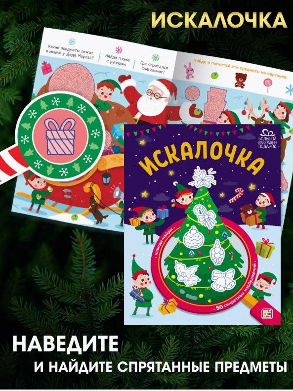 Искалочка - это занимательная книжка с лупой, с помощью которой можно искать предметы на специальных зашифрованных участках страниц.