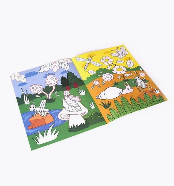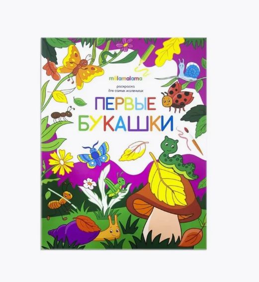 Раскраска для самых маленьких "Первые букашки" изготовлена из плотной бумаги. Все рисунки выполнены широким разноцветным контуром, расположены на цветном фоне.
