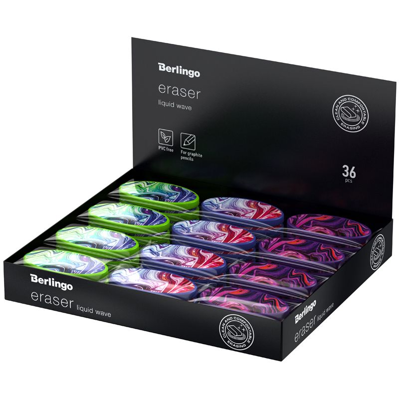 Ластик Berlingo Liquid Wave выполнен из термопластичной резины. Не токсичен, не содержит ПВХ и фталатов. Изделие прекрасно справляется с линиями от чернографитного карандаша, не оставляет следов и грязных разводов после себя, не повреждает бумагу.