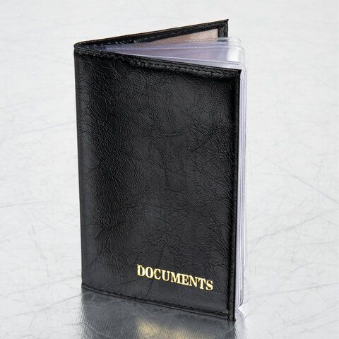 Обложка для автодокументов выполнена из экокожи черного цвета с тиснением "DOCUMENTS". Вмещает в себя 6 пластиковых карманов: