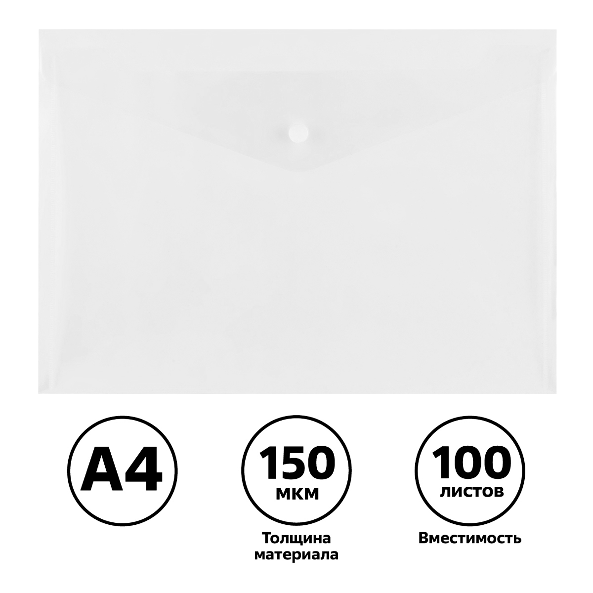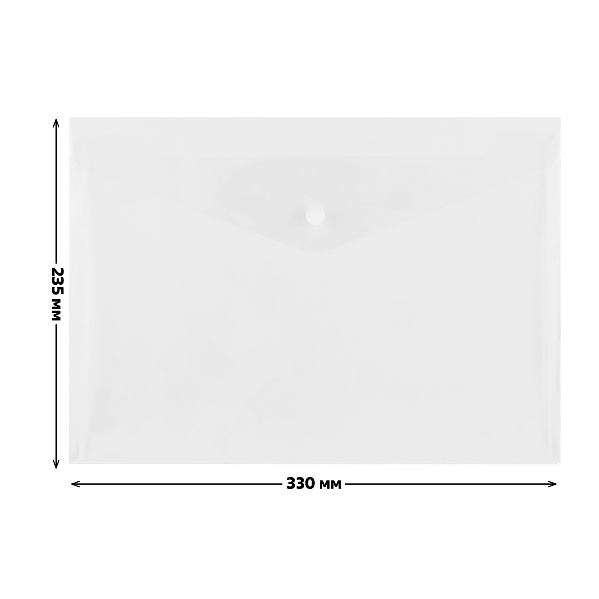 Папка-конверт на кнопке «СТАММ» формата А4 надёжно защищает документы от влаги и пыли. Горизонтальная папка вмещает до 100 листов. Цвет папки – прозрачный бесцветный. Папка изготовлена из качественного полипропилена плотностью 150 мкм с глянцевой текстурой. Размер папки составляет 330*235 мм. Изделие плотно закрывается клапаном с кнопкой.