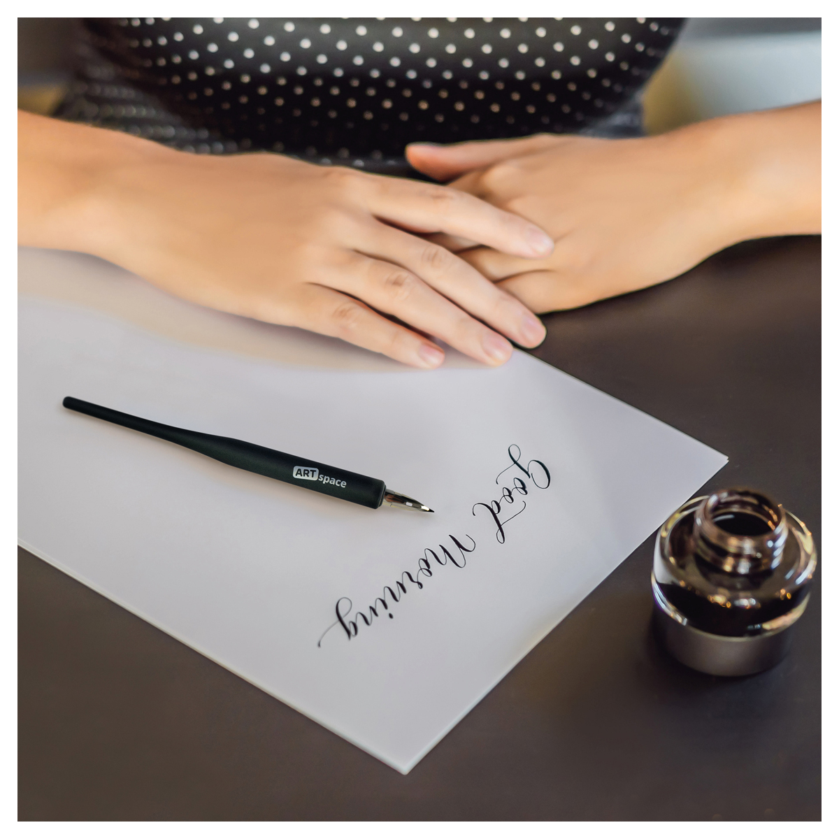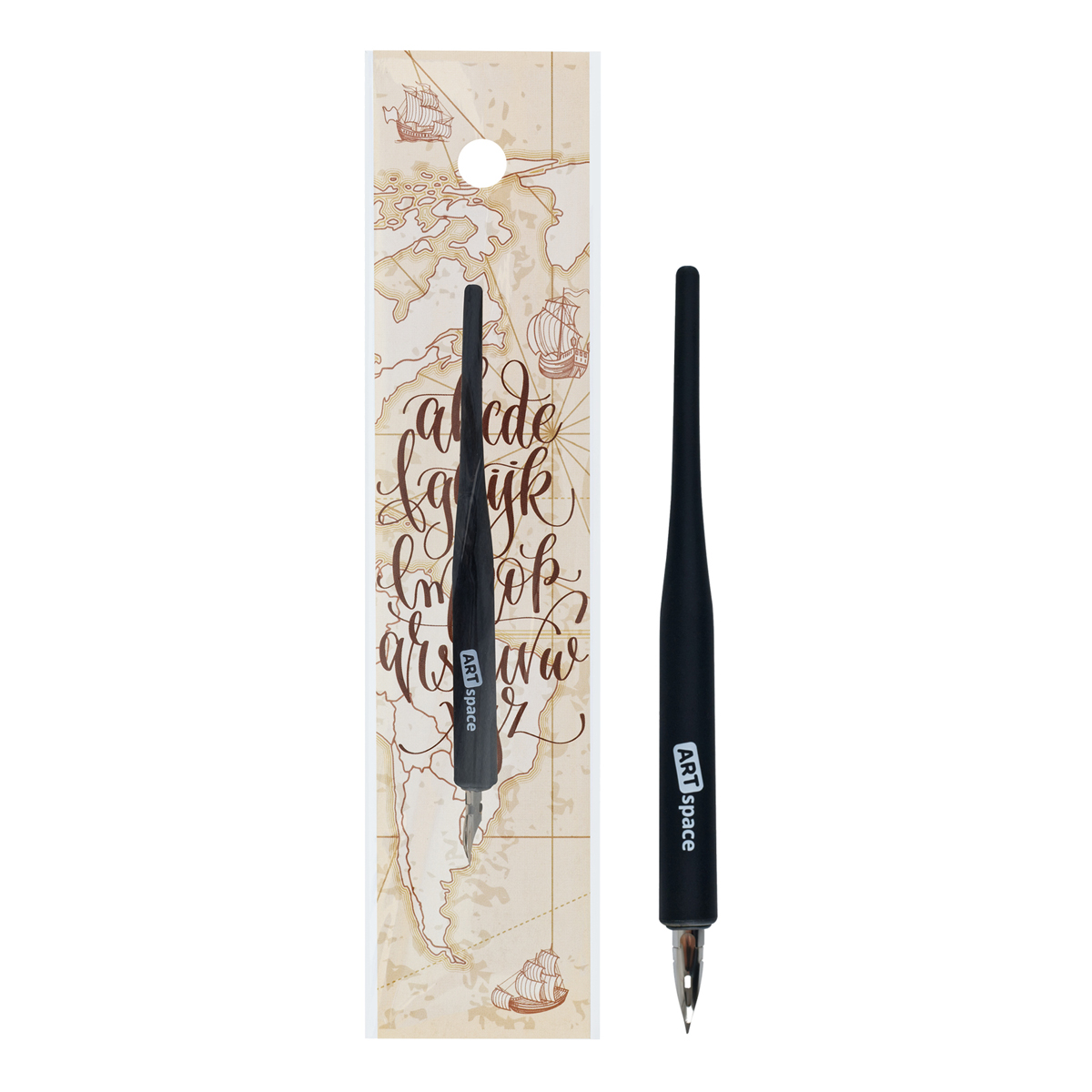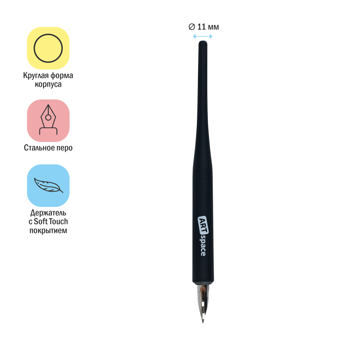 Универсальное каллиграфическое остроконечное перо ArtSpace с держателем идеально подходит для оформительских работ, рисования и каллиграфии. Материал пера – сталь. Толщина линии письма варьируется 0,3 до 0,5 мм. Тонкая линия письма, удобный чёрный пластиковый круглый держатель с soft-touch-покрытием. Перо упаковано в пакет.