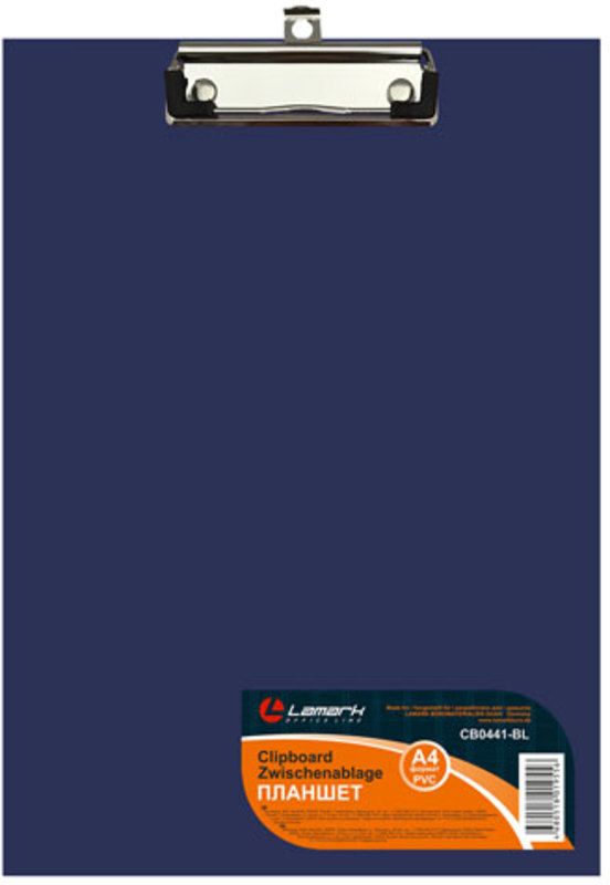 Планшет Lamark c верхним металлическим зажимом выполнен из плотного картона, заламинированного PVC пленкой. Толщина 2 мм. Цвет синий. Для документов формата А4. Еврофурнитура: зажим с подвесом, с пластмассовыми уголками. Широкое применение - склад и логистика, торговые представители, курьерские службы, внешкольные занятия.