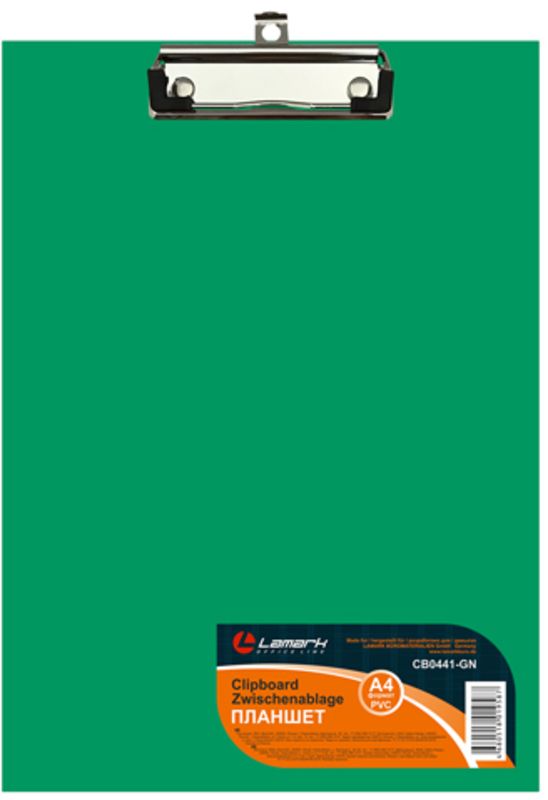 Планшет Lamark c верхним металлическим зажимом выполнен из плотного картона, заламинированного PVC пленкой. Толщина 2 мм. Цвет зеленый. Для документов формата А4. Еврофурнитура: зажим с подвесом, с пластмассовыми уголками. Широкое применение - склад и логистика, торговые представители, курьерские службы, внешкольные занятия.