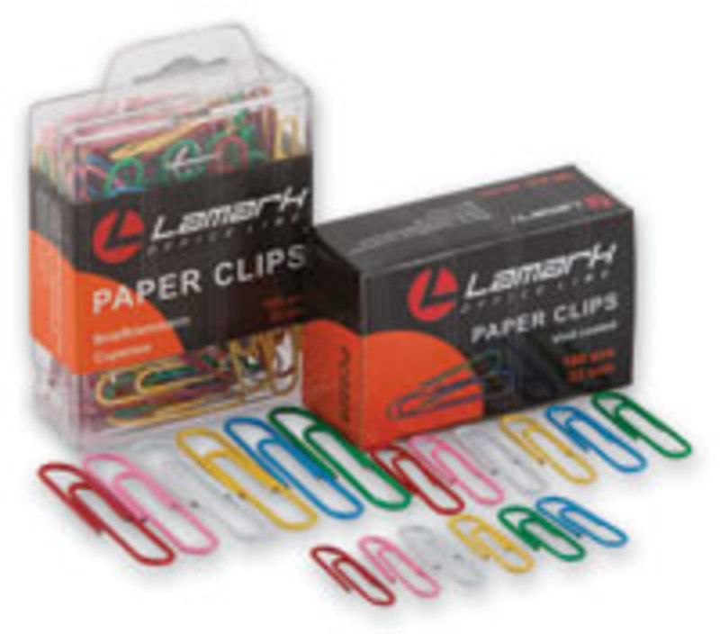 Скрепки Lamark металлические с цветным виниловым покрытием, размер 28 мм, 100 штук в цветной картонной упаковке.