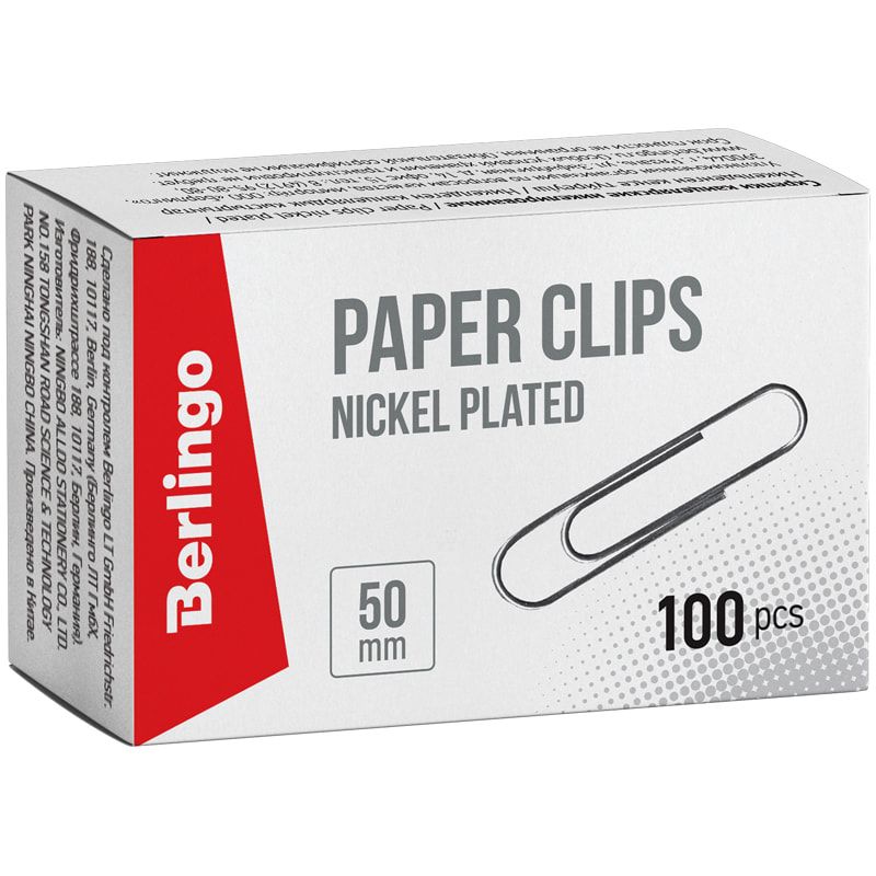 Скрепки 50 мм Berlingo 100шт., никелированные, карт. упак.