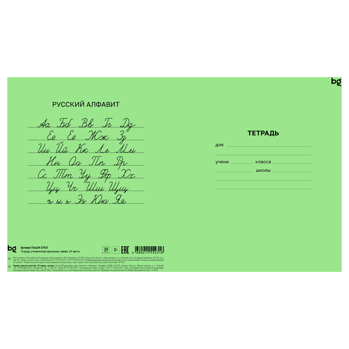 Тетрадь BG с зеленой обложкой состоит из 24 листов и предназначена для дошкольников и учащихся начальных и средних классов. Изготовлена в соответствии с ГОСТ Р 54543-2011.