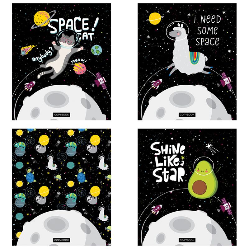 Тетрадь общая ArtSpace формата А5 (165*205) на скобе состоит из 48 листов. Внутренний блок - это офсетная бумага плотностью 60 г/м², белизна - 100%, линовка – клетка с полями. Обложка тетради изготовлена из мелованного чистоцеллюлозного импортного картона с отделкой гибридным выборочным УФ-лаком. Обложка тетради ArtSpace «Космос. Fantastic space» – это микс ярких дизайнов с различными рисунками космического пространства с участием забавных животных и авокадо.