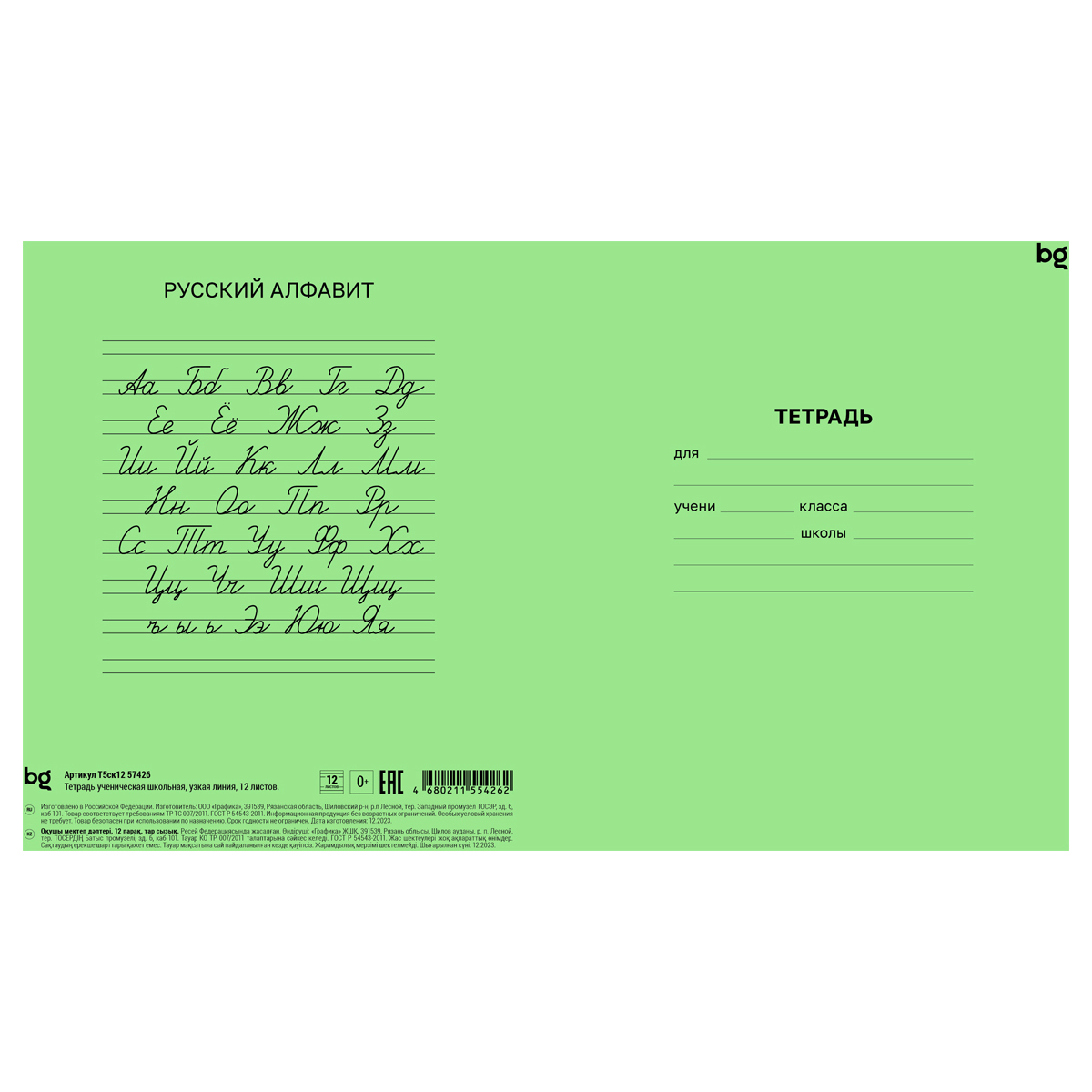 Тетрадь BG с зеленой обложкой состоит из 12 листов и предназначена для дошкольников и учащихся начальных и средних классов. Изготовлена в соответствии с ГОСТ Р 54543-2011.