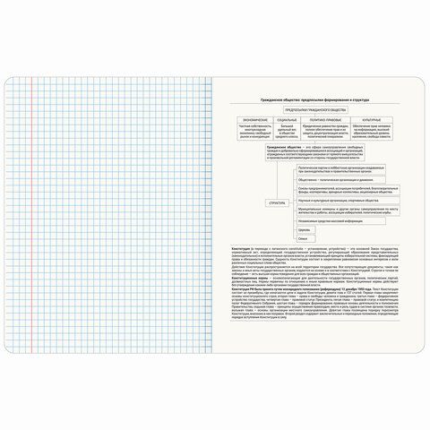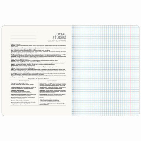 Тетрадь по обществознанию 48 листов, формат А5 (165х202 мм). Изготовлена из высококачественной офсетной бумаги 100% белизны плотностью 60 г/м2. Листы соединены скобами. Линовка блока – в клетку, поля красные. Обложка выполнена из мелованного картона плотностью 190 г/м2. В справочном материале собраны основные подсказки по школьному предмету для учащихся.