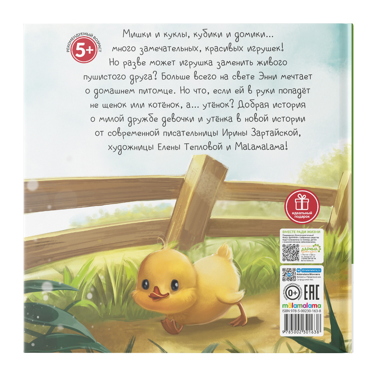 Сказка «Энни и утенок» детской писательницы Ирины Зартайской – это добрая история о милой дружбе девочки и утёнка. Мишки и куклы, кубики и домики... много, много замечательных, красивых, любимых игрушек! Но разве может игрушка заменить настоящего, живого, пушистого друга? Больше всего на свете Энни мечтает о домашнем питомце. Готова ли она ухаживать за ним? Понимает ли она, что питомец — это большая ответственность? А что, если ей в руки попадёт не щенок или котёнок, а... утёнок?