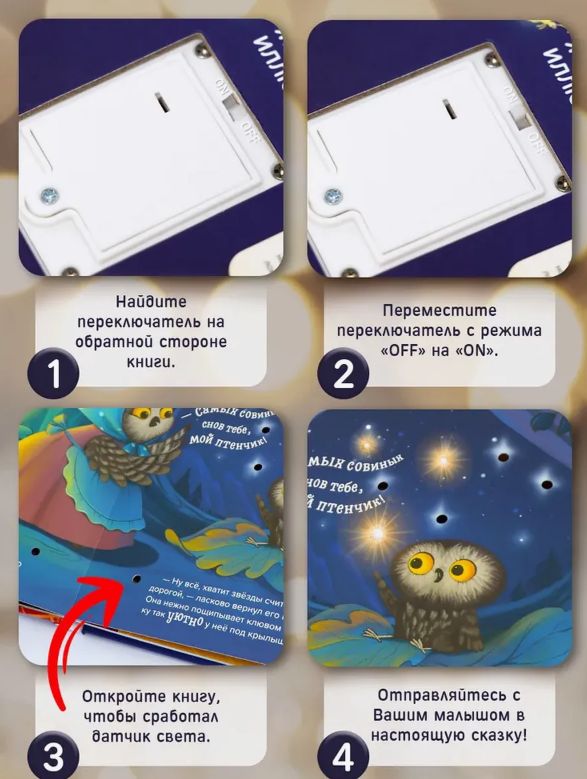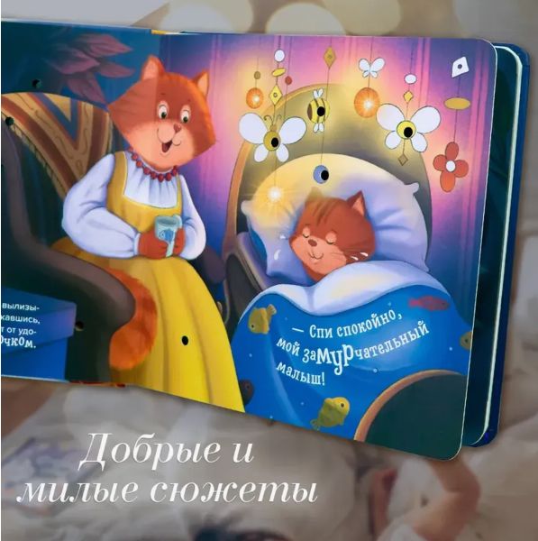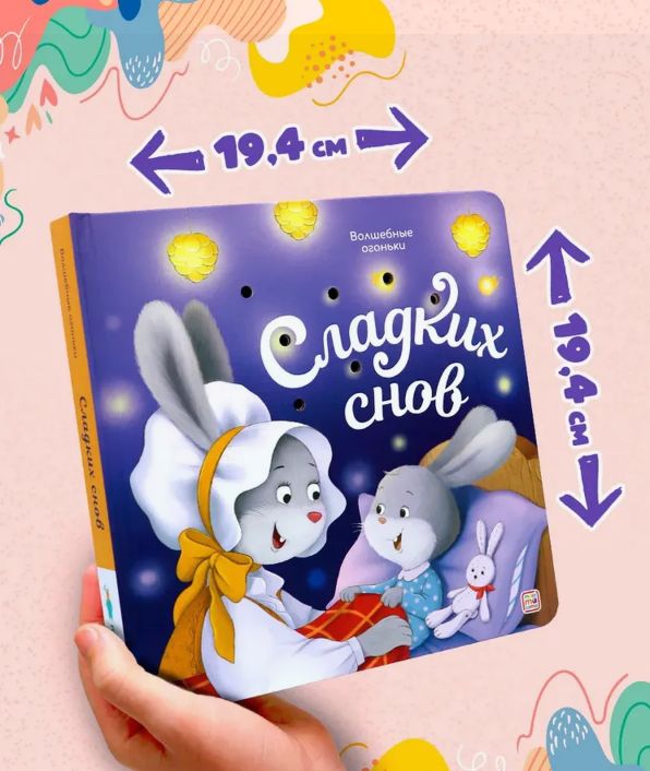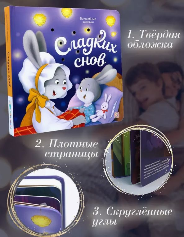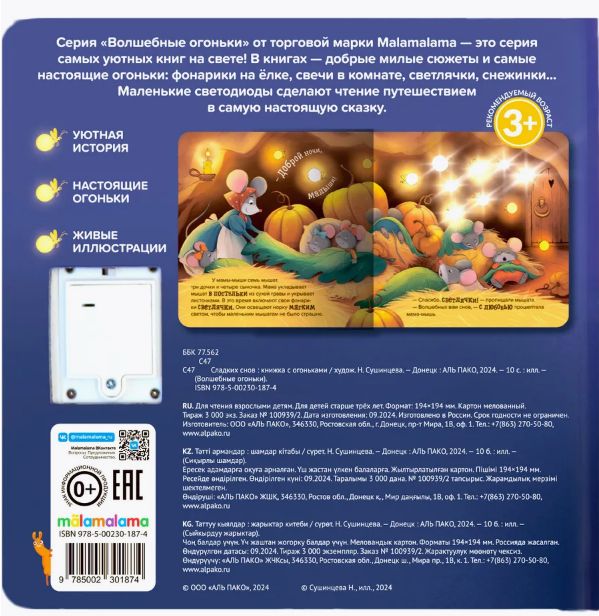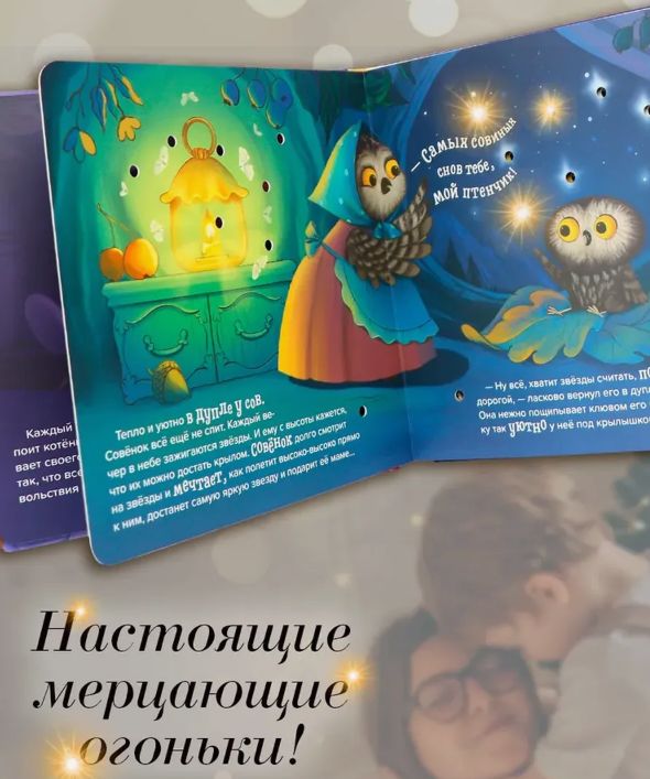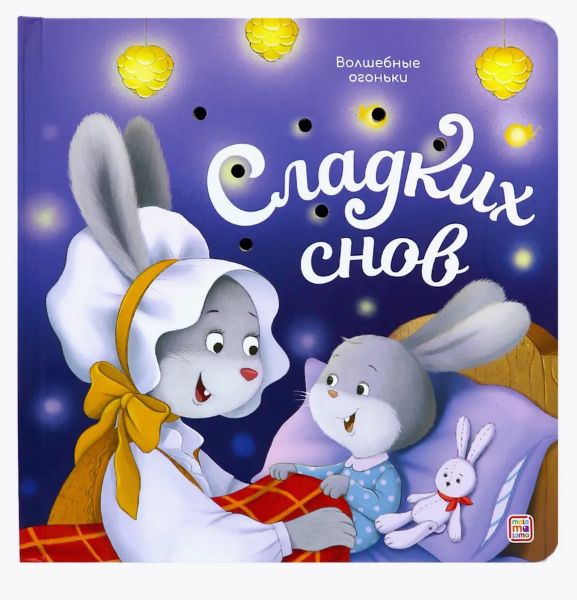 Волшебные огоньки. Сладких снов: «Волшебные огоньки» — новая серия от торговой марки Malamalama! Самая уютная книга на свете — «Сладких снов» — расскажет малышу, как лесные мамы укладывают спать своих малышей-зверят. Как зверята готовятся к Новому году? С какими чудесами они столкнутся? Милые иллюстрации, добрые персонажи и самые настоящие огоньки на страницах ждут ребёнка в книге. Фонарики на ёлке, свечи в комнате, светлячки или снежинки — внутри каждой страницы располагаются светодиоды, которые выглядывают в крошечные отверстия, заставляя их на самом деле светиться.